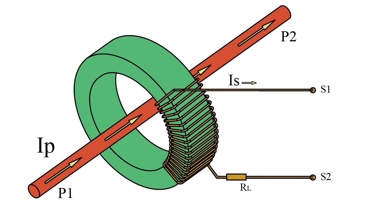 The primary current IP flows in from the P1 terminal and out from the P2 terminal; the secondary current flows out from the S1 terminal and flows in from the S2 terminal.