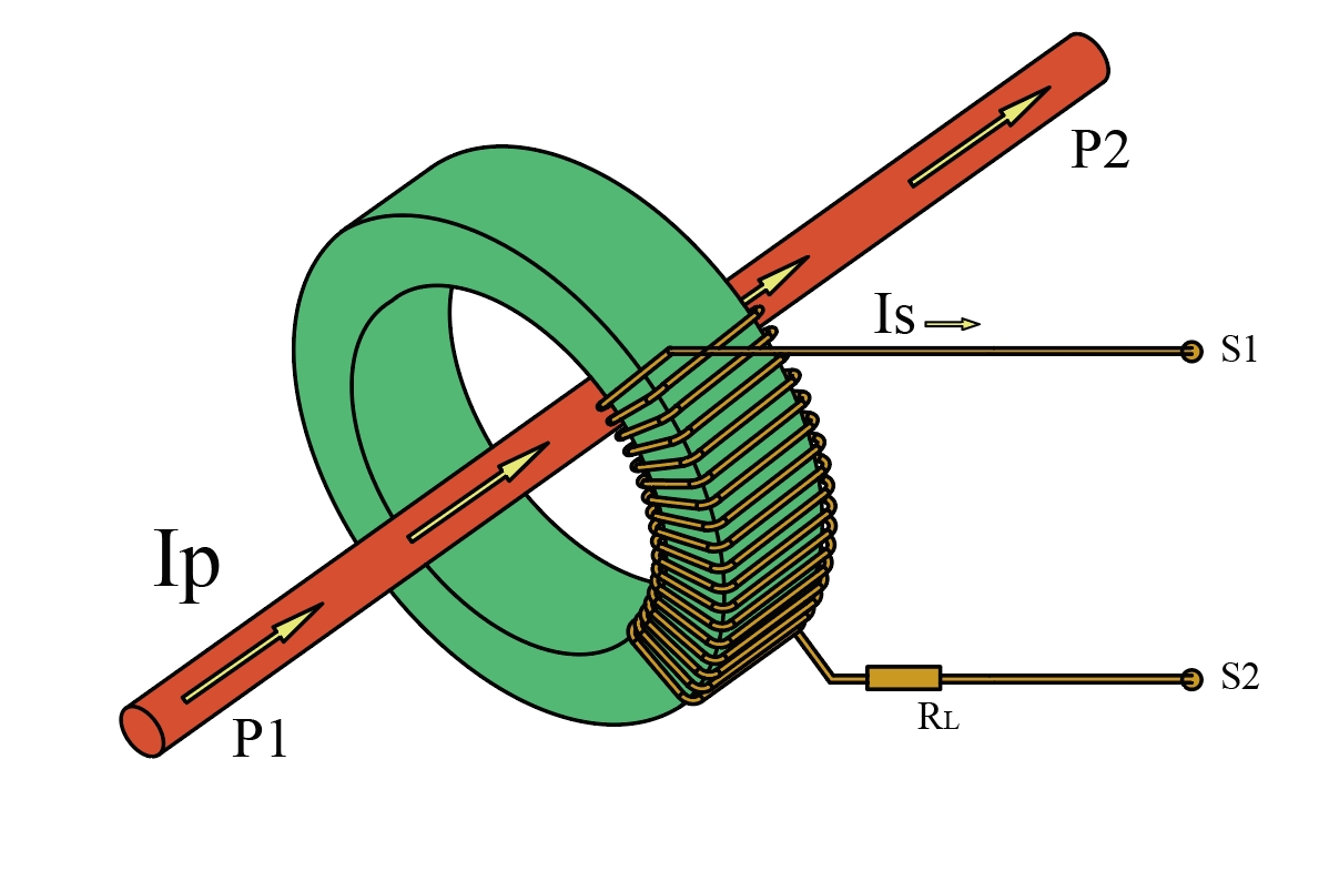 The primary current IP flows in from the P1 terminal and out from the P2 terminal; the secondary current flows out from the S1 terminal and flows in from the S2 terminal.
