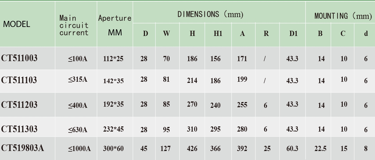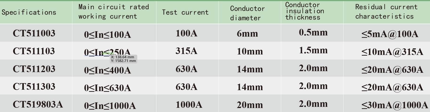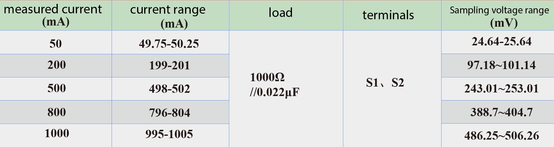 When the residual current transformer passes the corresponding sinusoidal AC current, its output sampling value voltage should meet the requirements in the following table.