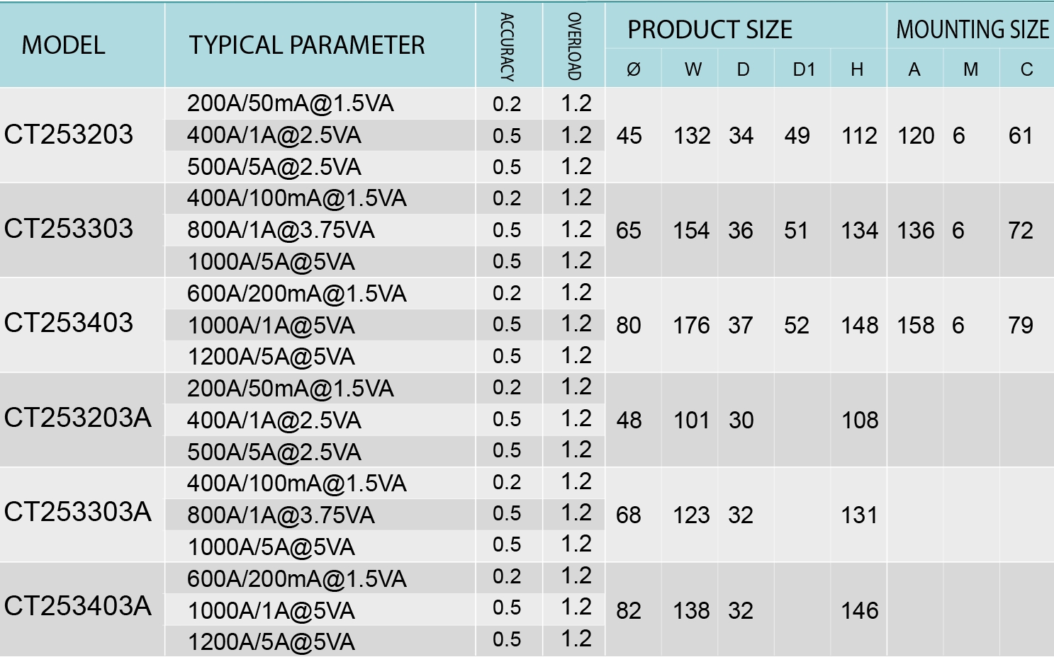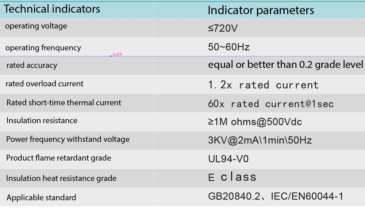 This series of products has 3 size specifications, which can measure cables with a current range of 100A-1200A. According to the requirements, the accuracy can be 0.2, 0.5, 1.0, etc. The secondary output signal can be a standard current of 5A/1A or a small signal current of mA level.
