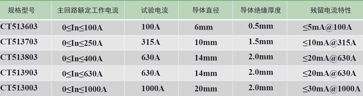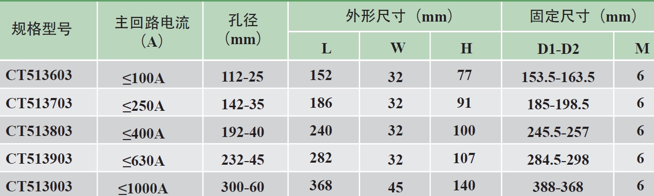 513矩形系列包含5個規格,適用于母排總寬度在300mm以內的回路中,基本可以滿足1000A以下配電回路的所有剩余電流的檢測。