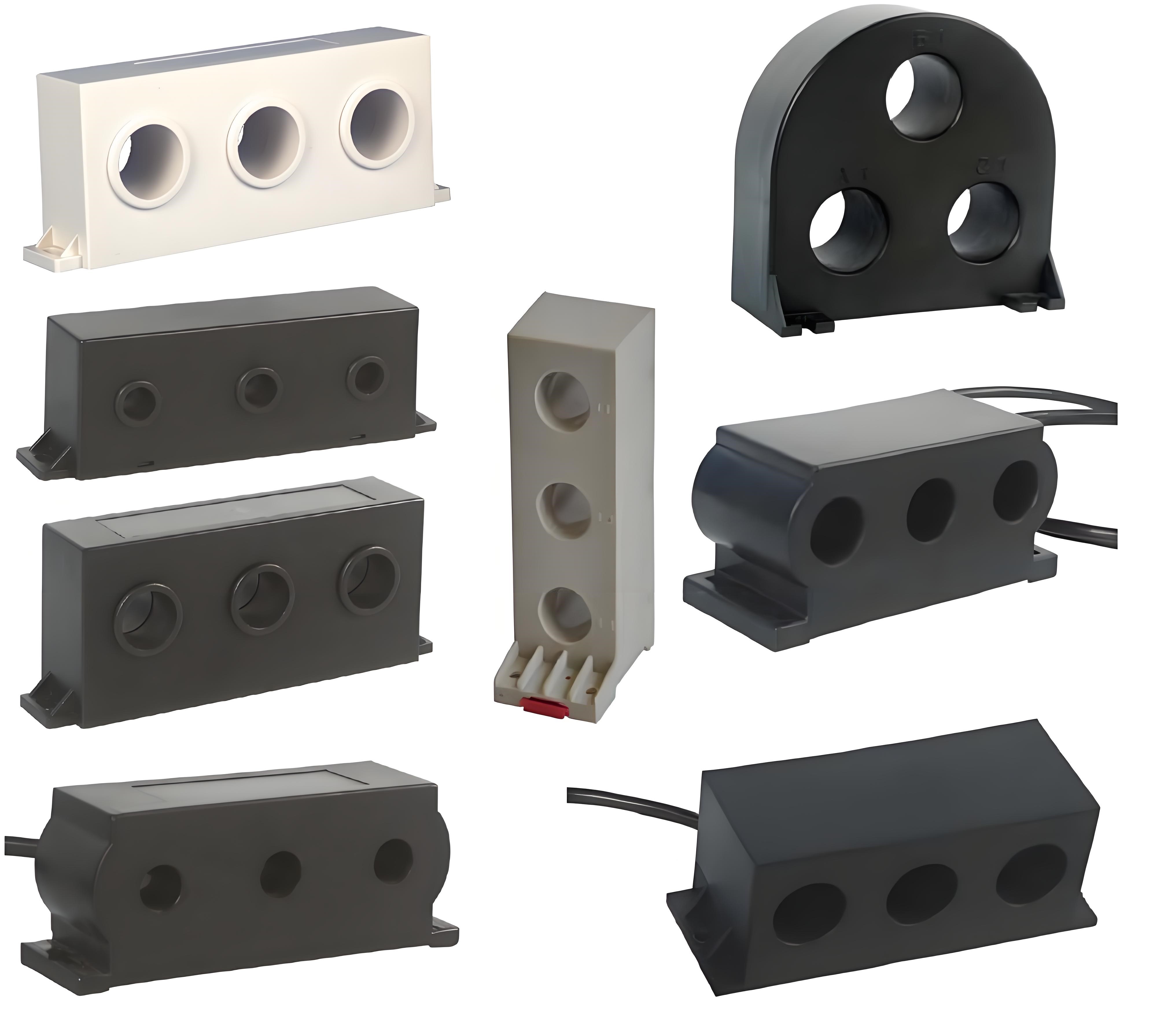應用于多功能表的信號測量方面時,首先需要明確多功能表適配互感器的初級電流大小和變比;再需要明確配電電路環境,安裝于電纜環境還是銅排環境,然后明確互感器的開窗規格和互感器尺寸。當應用在銅排配電環境時,不但需要明確互感器的窗口尺寸必須滿足銅排的規格參數,還需要注意互感器的窗口排列間距必須和銅排的排距相同,否則無法滿足安裝,給施工造成麻煩;然后根據多功能表的接入方式明確互感器的輸出方式;這樣基本上選定了互感器的型號。